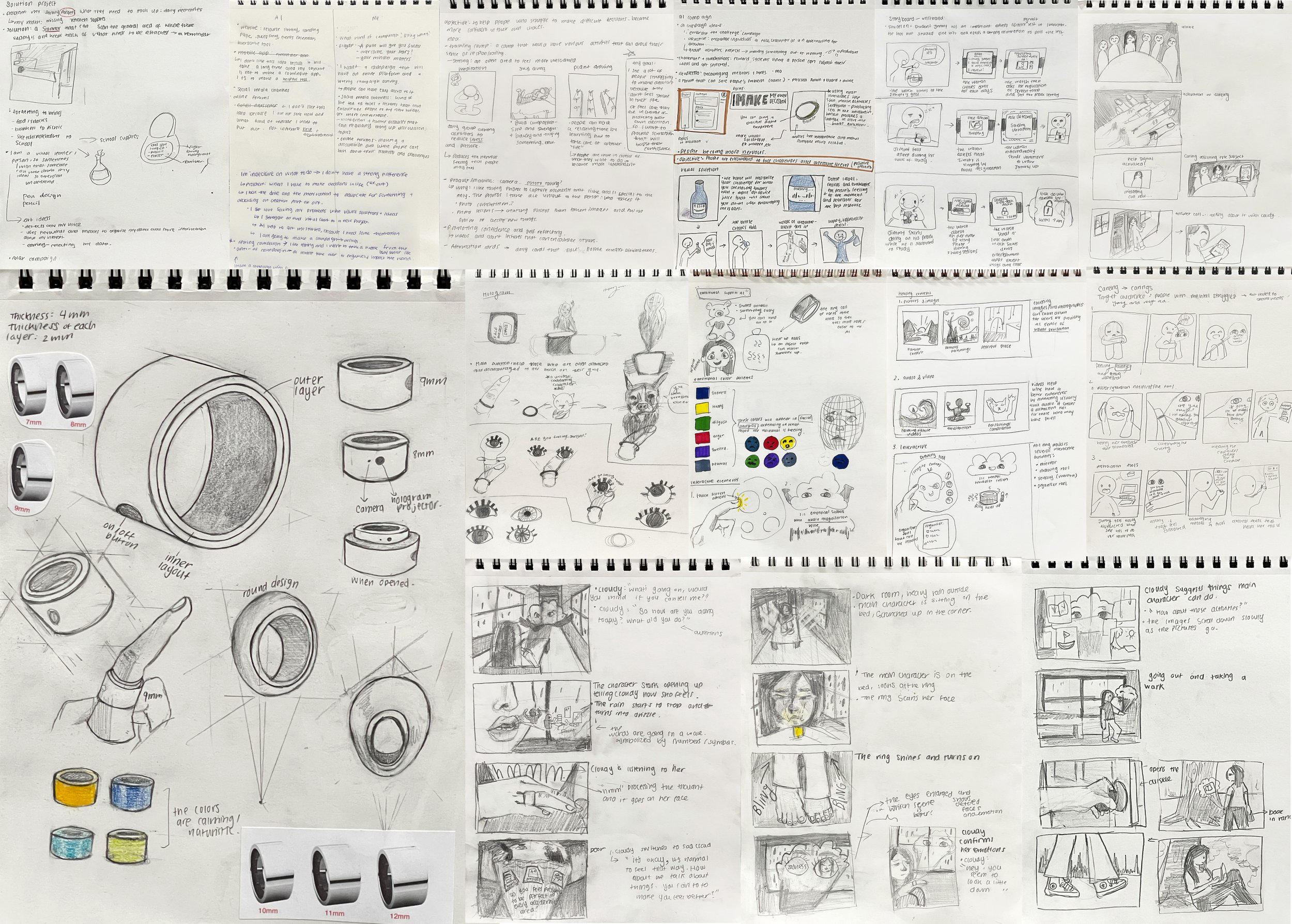 This piece is a promotional video that exemplifies a situation where one may be stressed by deadlines and studying with a clear mind. The CareAm ring utilizes facial recognition technology to detect emotions and further helps individuals understand their needs. When the ring detects instability in one's emotions, it carefully analyzes the problem once more and gives them a solution, such as going outside or listening to music (or both!). Through this video, the viewers are able to understand how the product will function in their daily lives, hopefully bettering their mindset and giving them immediate support.
